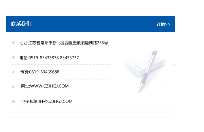 地址:常州市新北區友邦商務大廈1幢16、17層  電話:0519-85101652  傳真:0519-85112595  郵編:213022  網址:www.cz-jiayue_cn.51kandiqiu.com  郵箱:xiajifengaa@163.com